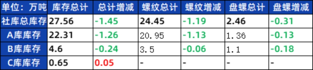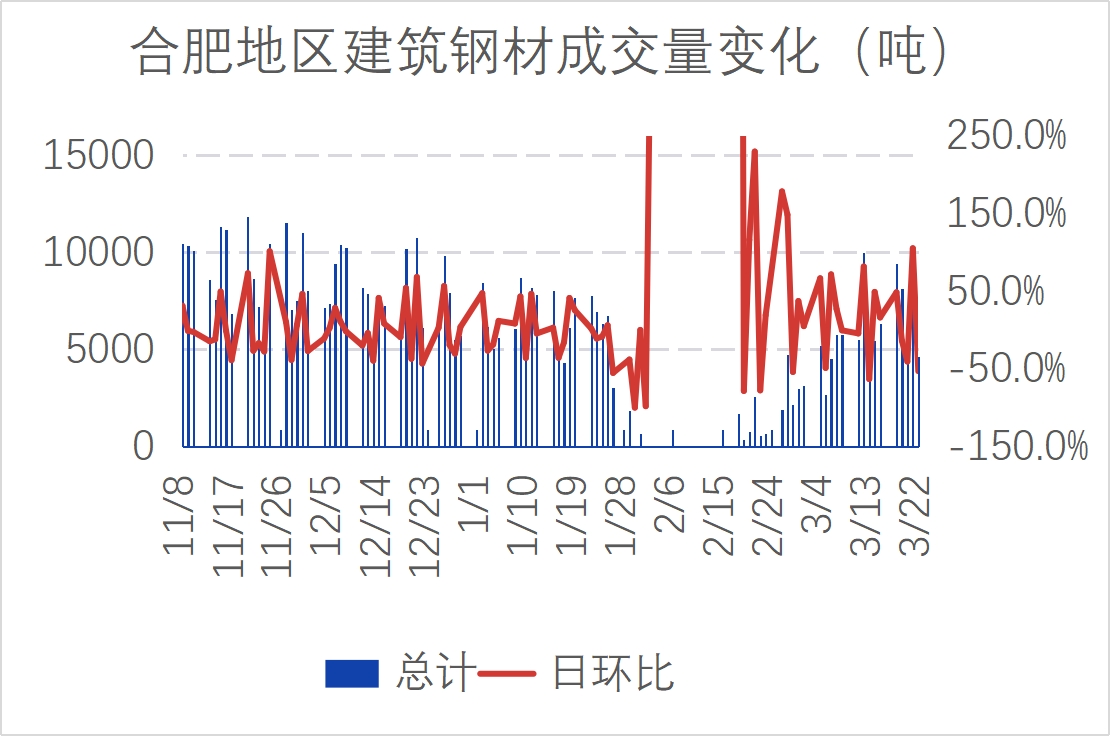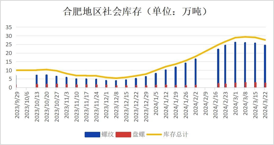 库存方面,本周合肥建材社会库存小幅减少,降库速度有所加快。截止3月22日,合肥建材社会库存为27.56万吨,较上周五减少1.45万吨,下降5%。其中螺纹钢24.45万吨,减少1.19万吨,下降4.64%;盘螺2.46万吨,减少0.31万吨,下降11.19%。从库存变化来看,盘螺下降幅度更大。