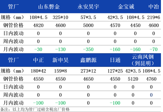 今天主流无缝管出厂报价持稳。目前从厂家的出货情况看,本周以来日均出货量呈现递减的趋势,下游市场交投氛围不好,因此商家补库比较谨慎,而期货盘面走势并不理想, 上游管坯价格也再次下跌,管厂虽有意挺价,但各市场之间竞争激烈,需求和成本对于价格支撑均偏弱,预计今天无缝钢管价格继续弱势运行。