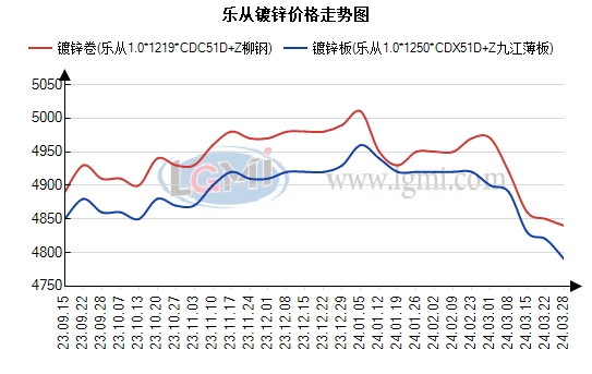 乐从地区镀锌板卷价格偏弱运行。据兰格钢铁云商平台监测数据显示,现镀锌1.0mm价格:本钢4790元,鞍钢4870元,首钢凯西4440元,攀钢5120元,柳钢4840元,首钢4990元,九江薄板4790元,华津4350元,含税。