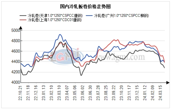 据兰格钢铁网监测数据显示,截至3月27日,全国1.0mm冷轧市场均价为4419元(吨价,下同),月环比下降252元。主导城市上海唐钢1.0mm冷轧卷市场价格为4390元,月环比下降280元;乐从柳钢1.0mm冷轧卷4390元,月环比下降210元;天津唐钢1.0mm冷轧卷4300元,月环比下降250元。