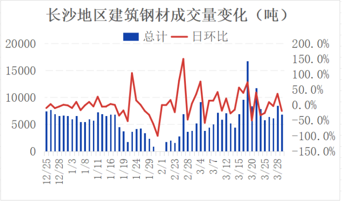 库存方面,长沙建材社会库存去库明显,截止3月28日,长沙建材社会库存为37.74万吨,较上周同期减少3.51万吨,其中螺纹钢26.57万吨,盘线11.17万吨,盘线占比29.5%。