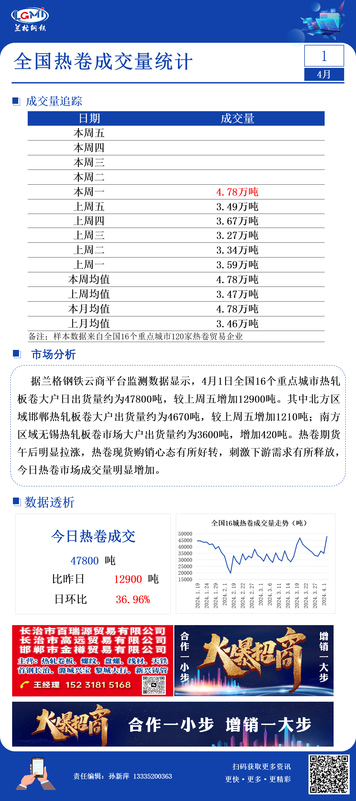 - 4月1日全国16个城市热轧板卷大户日成交量增加2024/4/1