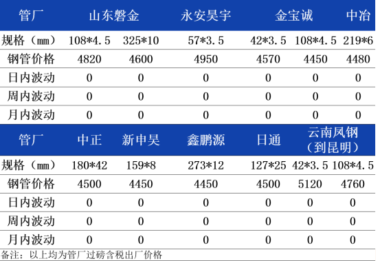 今天主流无缝钢管出厂报价持稳。管厂出货持续减量,导致厂家的库存又有累库的迹象,而随着昨日至今盘面震荡上探,厂家有意上探,但是盘面反弹的持续性有待观察,所以市场补库依旧谨慎,不过清明节假期降至,加上行情止跌,无缝管市场的交投氛围略有回暖,商家有少量备货的可能,预计今天无缝管市场止跌企稳,以出货为主。