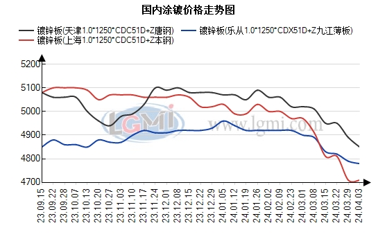4月3日国内涂镀板卷价格主稳个调。据兰格钢铁云商平台监测数据显示:现国内重点城市1.0mm镀锌板平均价格4797元,较上一个交易日价格涨3元。其中,天津1.0mm镀锌板价格5120元,较上一交易日价格持平;上海1.0mm镀锌板价格4710元,较上一交易日价格持平;乐从1.0mm镀锌板价格4850元,较上一交易日价格涨10元。现国内重点城市0.47mm彩涂板平均价格5870元,较上一个交易日价格跌10元。其中,天津0.47mm彩涂板价格5150元,较上一交易日价格持平;上海0.47mm彩涂板价格6500元,较上一交易日价格持平;广州0.47mm彩涂板价格6200元,较上一交易日价格跌100元。