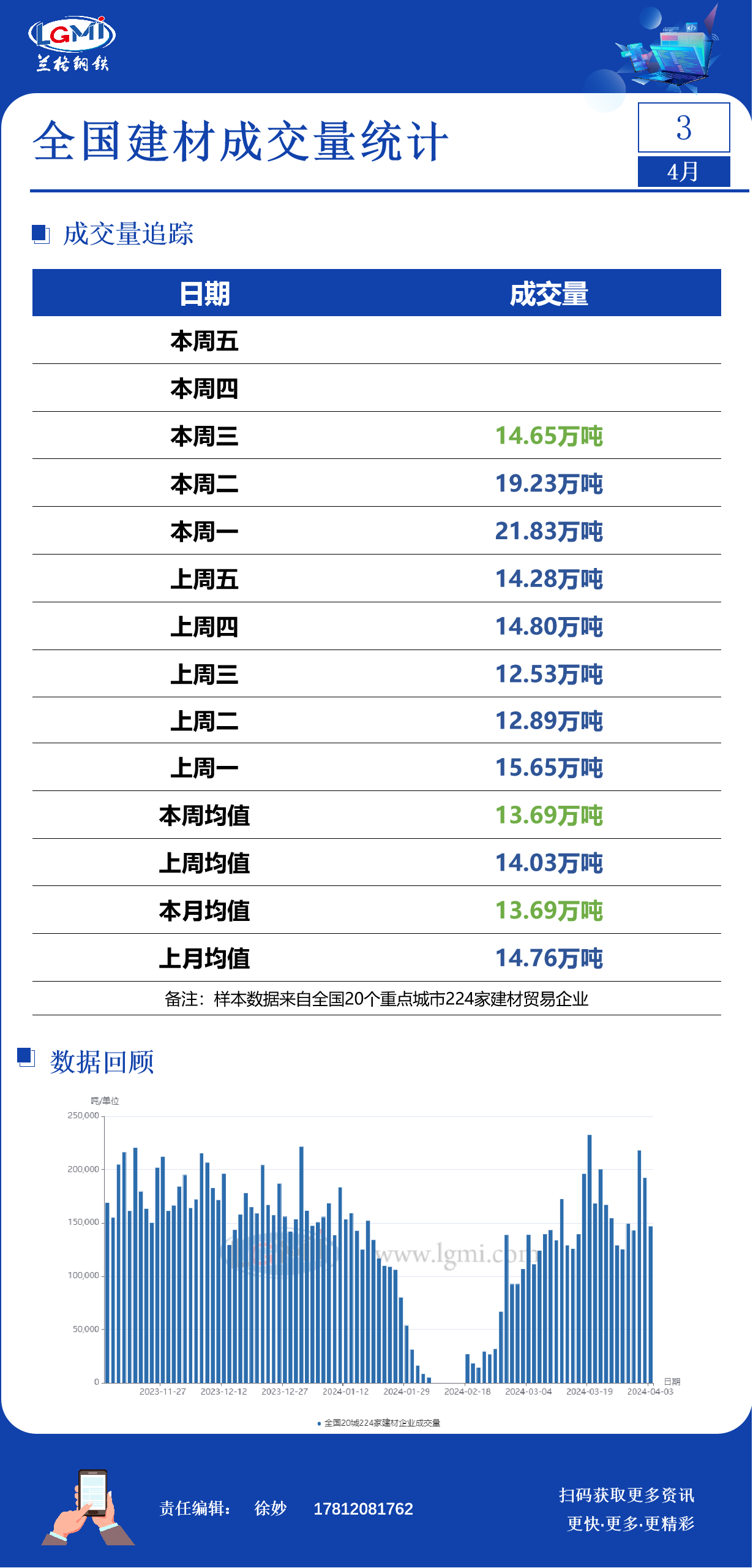 - 4月3日全国建材成交量大幅减少2024/4/3