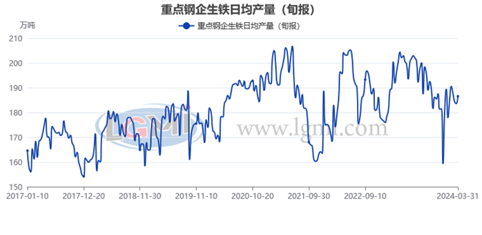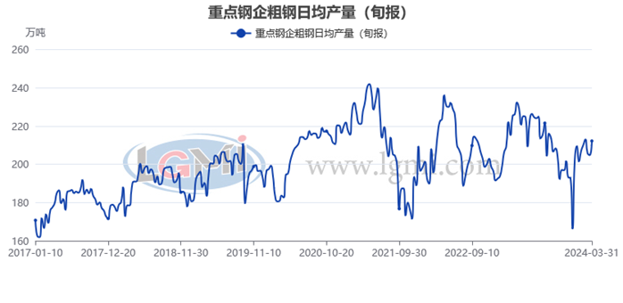 据中国钢铁工业协会统计数据显示,2024年3月下旬重点钢企生铁日均产量186.61万吨,旬环比上升1.63%,同比下降6.96%;3月下旬重点钢企粗钢日均产量212.18万吨,旬环比上升3.63%,同比下降6.14%;3月下旬重点钢企钢材日均产量211.77万吨,旬环比上升7.76%,同比下降6.53%。
