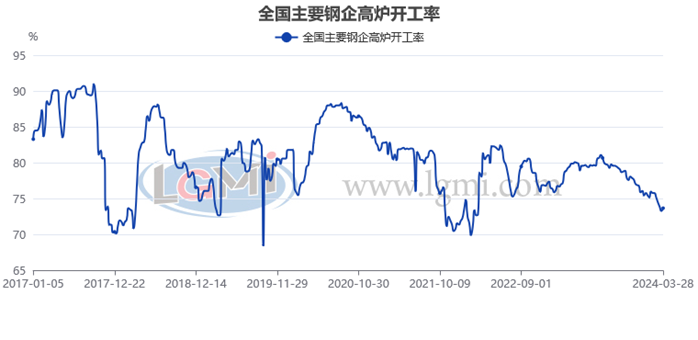 从目前高炉开工率变化来看,钢铁企业生产释放力度呈现小幅波动下降的态势。据兰格钢铁网调研数据显示,2024年3月份全国主要钢企高炉开工率为73.9%,较上月均值下降1.7个百分点(详见图4);全国201家生产企业铁水日均产量均值为215.8万吨,较上月均值减少2.7万吨,3月份全月呈现先降后升的态势。