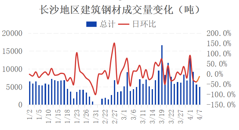 今日无期货,据市场部分商家反馈:清明假期长沙多雨水,期间成交偏弱,基本以项目刚需为主;7日兰格钢铁网调研统计长沙地区10家样本建材贸易商合计成交5010吨,较上一个交易日减少710吨。