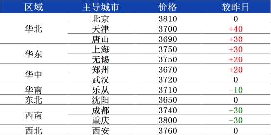南北价差方面,随着各地价格小幅调整,区域价差变化不大,其中乐从3710元、唐山3690元,两地价差基本持平,邯郸3660元、无锡3750元,两地价差90元左右。