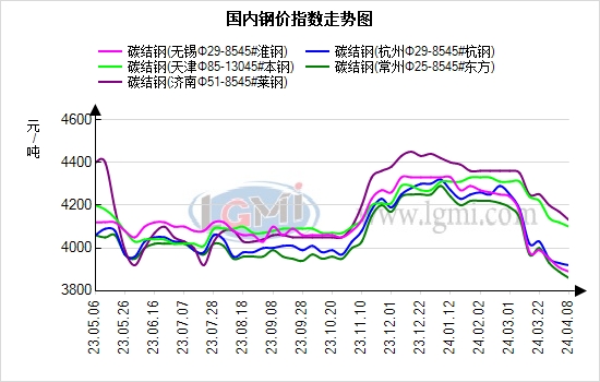 钢厂方面:4月8日福建三钢闽光特钢品种做如下调整, 1、45#碳结钢Φ20-80价格下调100,Φ20-Φ72出厂挂牌现款价为4150元/吨; 2、40Cr合结钢Φ20-80价格下调100元,Φ20-Φ72出厂挂牌现款价为4350元/吨。