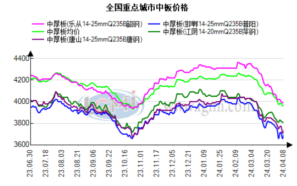 4月8日国内中厚板市场价格盘整,部分区域价格小幅上涨10-40元不等。据兰格云商平台监测数据显示,国内重点城市16-25mm普板平均价格为3811元,较上个成交日涨6元,较上周同期降41元。