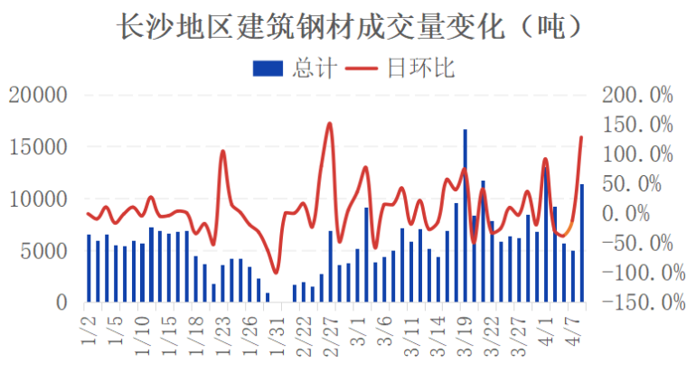 今日长沙市场建材价格小涨,盘面强势收复3月27日以来的跌幅,预计明日长沙建材价格上涨。