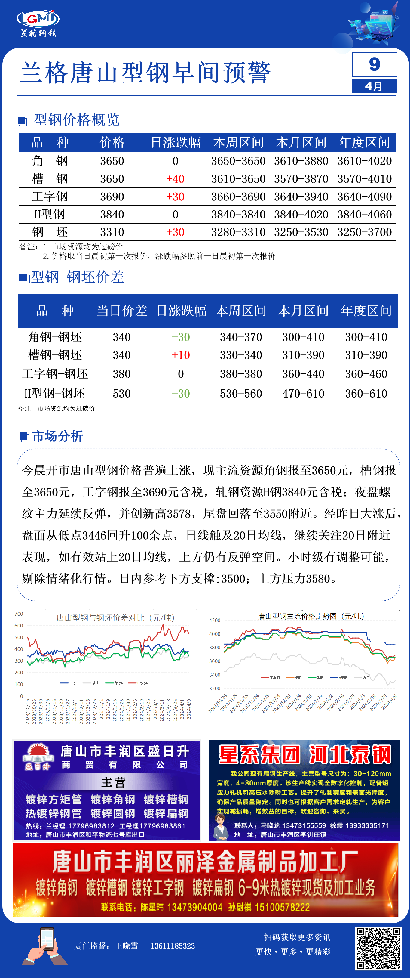 - 4月9日兰格唐山型钢早间预警2024/4/9