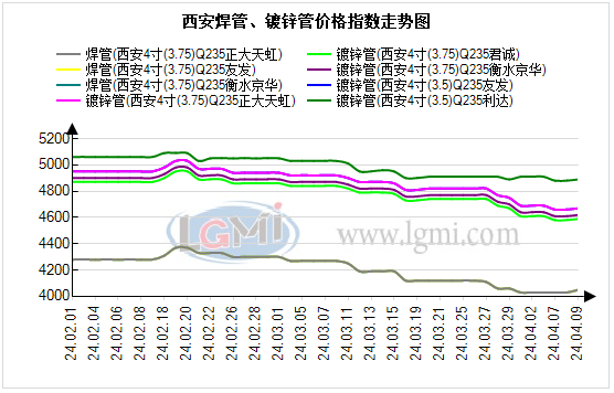 4月9日,西安市场焊管、镀锌管价格小幅上涨,成交明显增加。据兰格钢铁云商平台监测数据显示:焊管4寸(3.75mm)价格为4050元,较上个交易日涨20元;镀锌管4寸(3.75mm)利达4890元,友发4670元,正大4670元,君诚4590元,衡水京华4620元,与上一交易日价格上涨10元。