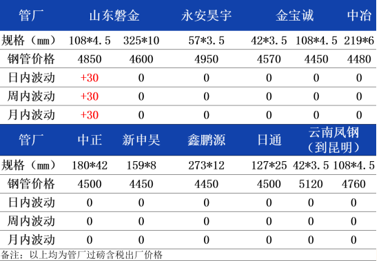 今天主流管厂出厂报价持稳。从本周管厂出货情况开看,市场资源流转速度放缓,前期集中释放的需求逐渐被消耗殆尽,商家谨慎对待,