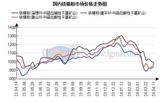 4月11日国产矿市场价格震荡运行。据兰格钢铁网监测数据显示,唐山地区66%酸粉湿基不含税主流市场价格为785元,较上一工作日价格持平;建平地区65%—66%酸粉湿基不含税市场价格为755元,较上一工作日价格涨5元;淄博地区65%—66%酸性干基含税现金市场价格为980元,较上一工作日价格持平。