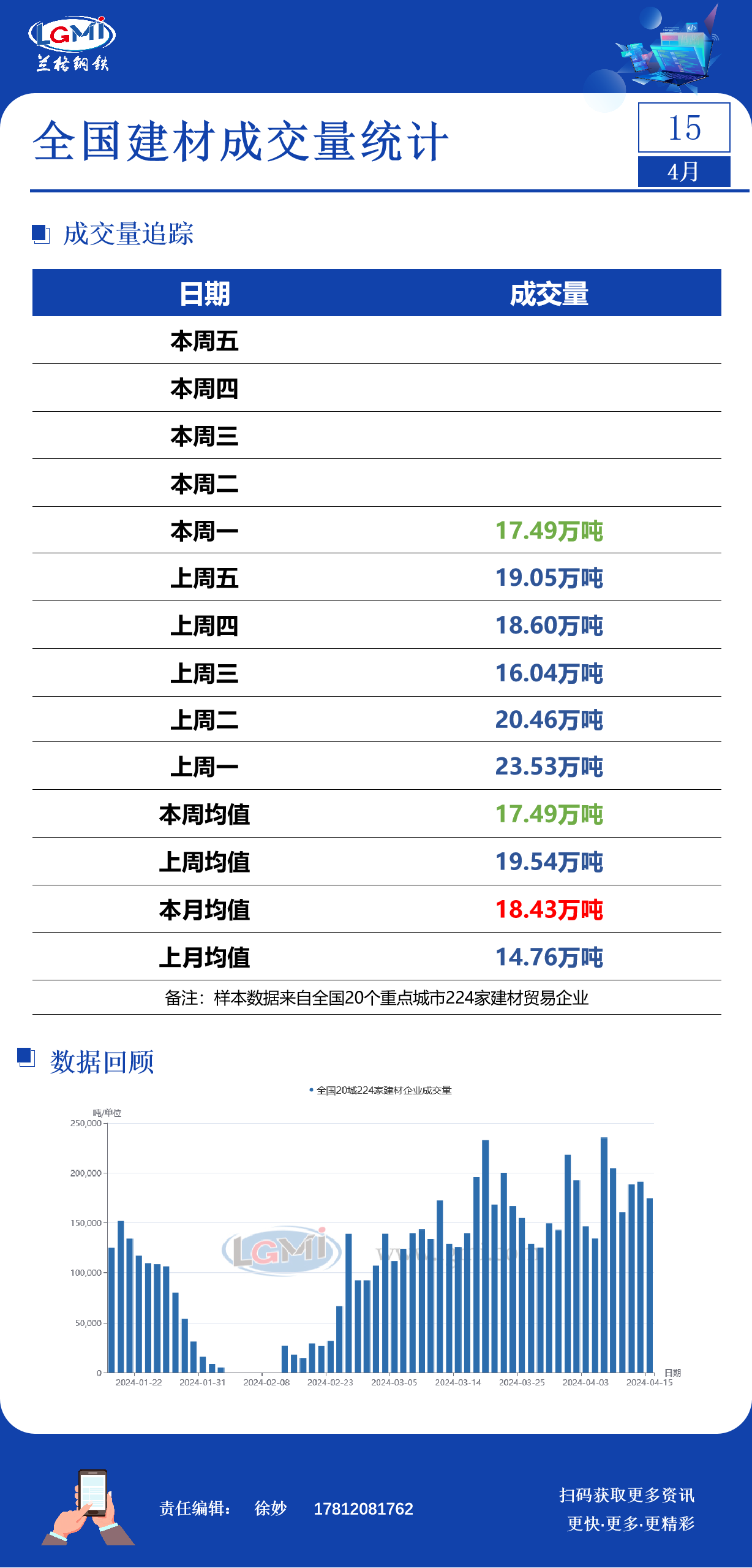 - 4月15日全国建材成交量小幅减少2024/4/15