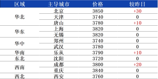 南北价差方面,重点城市乐从3790元、唐山3780元,两地价差维持平稳格局,邯郸3740元、无锡3820元,两地价差80元左右,较昨日收窄10元。