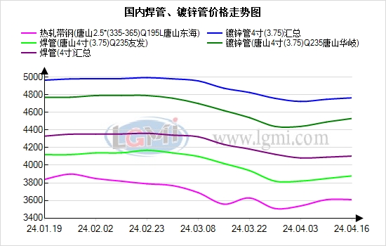 今日宏观数据陆续出台,一季度GDP超预期达到5.3%,中午前后期螺10合约震荡上探前高3630,同时上游价格上探10元,焊镀管厂价格政策陆续跟调,贸易商报价个别高靠,目前4寸*3.5mm镀锌管,华东地区主流报价4400-5000元;中南地区主流报价4500-5200元;华北地区主流报价4400-4750元;东北地区主流报价4400-4500元。