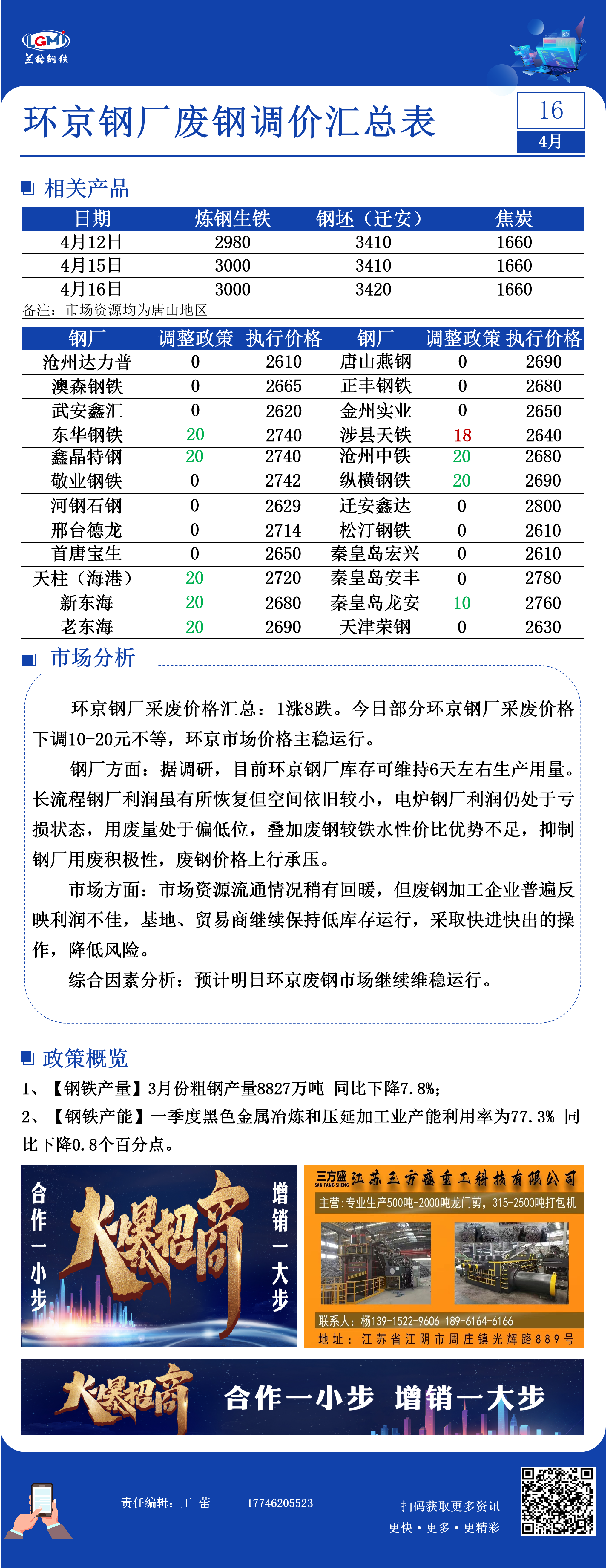 4月16日环京钢厂废钢调价汇总表