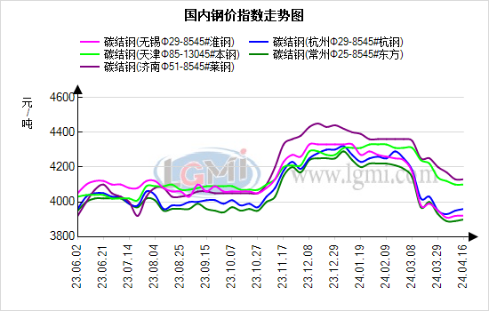 4月16日国内优特钢市场价格持稳运行。据兰格钢铁云商平台监测数据显示,国内重点城市45#碳结钢85mm平均报价4144元,40Cr合结钢85mm平均报价4332元,较上个交易日价格持平。