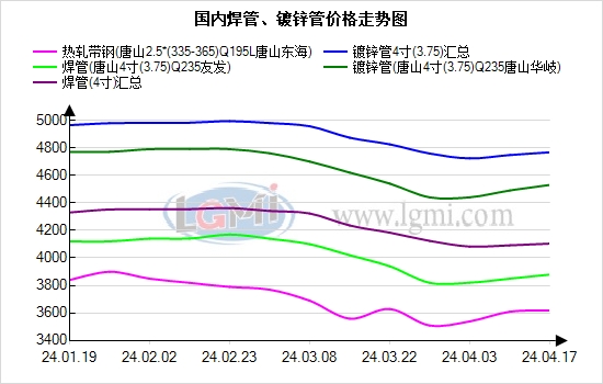 17日国内焊镀管市场价格局部跟涨。据兰格钢铁云商平台监测数据显示,国内重点城市,4寸*3.5mm镀锌管平均报价4767元,较上一交易日涨3元;焊管平均报价4104元,与上一交易日持平。