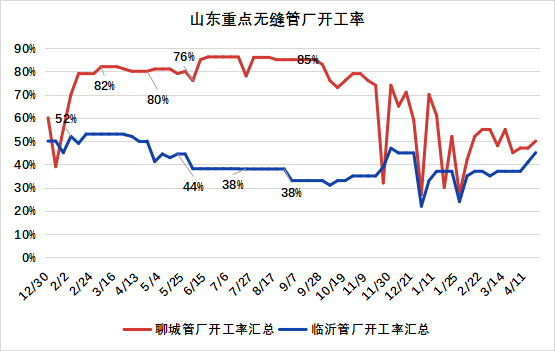4月第3周全国无缝管厂开工率56.35%,较上周上升0.28%。其中聊城无缝管厂开工率50%,较上周上升3%;临沂地区主流管厂开工率45%,较上周上升4%。管厂成本持续下移的情况下,本周厂家出货也有所好转,刺激其生产积极性。