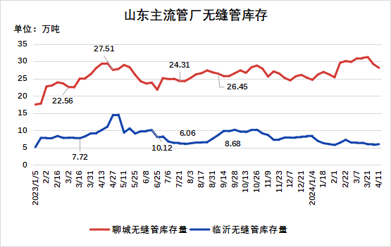 4月第3周全国46家主流无缝管厂库存76.25万吨,较上周减少0.63万吨,环比下降0.852%,其中山东临沂、聊城、潍坊、烟台21家样本无缝厂总库存45.83万吨,较上周减少2.09万吨,周环比下降4.35%。近期市场行情有止跌反弹之势,下游商家有抄底的操作,另外管厂在涨势行情下给予商家优惠政策刺激贸易商补库,厂家整体库存继续减量,但降幅有所放缓。