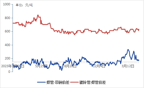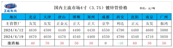 4月第3周,周初钢市高位略显疲态,上游强势而焊镀管厂跟涨难落地;周中公布GDP数据超预期叠加国债项目推进启动等利好信息发布,资金再次增仓做多,期螺主力合约快速突破前高3月跌价的起点位置,来到3700附近,上游钢厂日内涨幅走扩,焊镀管厂商跟涨积极性被带动。截至4月19日,唐山地区主导管厂成交价4寸(3.75)焊管3800元,周内涨50元;镀锌管4520元,周内涨70元。市场以南京焊管为例,南北方同厂资源价差收窄至150元左右,不利于北材南下的资源流通。