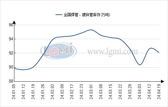 4月第3周,全国焊管社会库存总量92.07万吨,较上周减0.58万吨,去库节奏较慢。兰格钢铁云商平台监测数据显示,周内市场交易表现较平缓,涨价落实前阶段需求释放,而中下游寻低采购现象较多,在统计市场销量与上周变化不大,其中江苏以北区域需求尚可,不过新项目落地不足,用钢需求增量有限;南方区域降雨、大雾天气影响,同时资金到位情况改善不明显,项目方面无力推进。另外,据反馈管厂已有部分规格紧缺现象,供应端亦有所限制的情况下,成单难度加大。