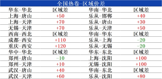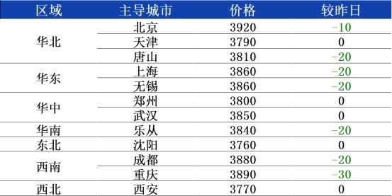南北价差方面,重点城市乐从3840元、唐山3810元,两地价差30元,邯郸3800元、无锡3860元,两地价差60元左右,价差处于窄幅扩张通道。