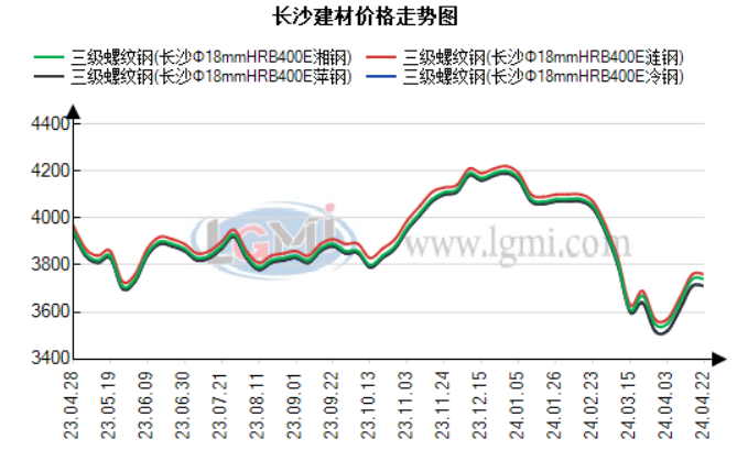 今日长沙建材价格持稳。据兰格钢铁研究中心监测显示:截至22日,长沙建材市场HRB400EΦ18mm螺纹钢萍钢3710元,冷钢3710元,湘钢3740元,涟钢3760元;