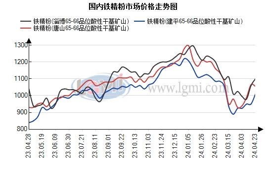 4月23日国产矿市场价格震荡运行。据兰格钢铁网监测数据显示,唐山地区66%酸粉湿基不含税主流市场价格为840元,较上一工作日价格跌10元;建平地区65%—66%酸粉湿基不含税市场价格为805元,较上一工作日价格涨5元;淄博地区65%—66%酸性干基含税现金市场价格为1100元,较上一工作日价格持平。