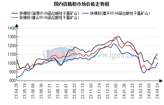 4月24日国产矿市场价格弱稳运行。据兰格钢铁网监测数据显示,唐山地区66%酸粉湿基不含税主流市场价格为830元,较上一工作日价格跌10元;建平地区65%—66%酸粉湿基不含税市场价格为805元,较上一工作日价格持平;淄博地区65%—66%酸性干基含税现金市场价格为1100元,较上一工作日价格持平。