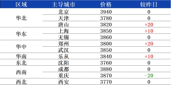 南北价差方面,重点城市乐从3840元、唐山3820元,两地价差20元,两地价差基本持平,邯郸3800元、无锡3860元,两地价差60元左右。