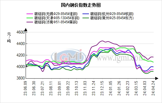 4月24日国内优特钢市场价格持稳运行。据兰格钢铁云商平台监测数据显示,国内重点城市45#碳结钢85mm平均报价4174元,40Cr合结钢85mm平均报价4362元,较上个交易日持平。
