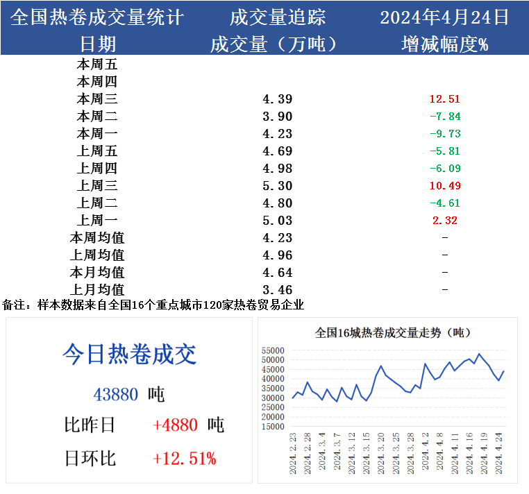 - 4月24日全国16个城市热轧板卷大户日成交量增加2024/4/24