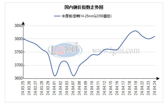 今日开市,邯郸地区中厚板市场价格涨10元。据兰格钢铁云商平台监测数据显示,邯郸地区普阳16-20mmQ235B中板市场价格在3810元涨10元,较月初涨150元,本月均价3752元,华北中厚板流通指数普阳报3820元,截止目前均价3749元;