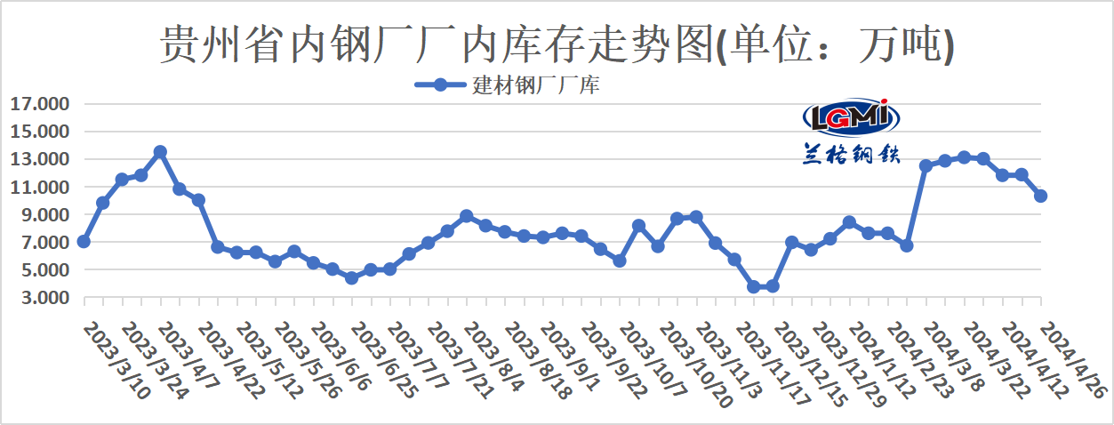 贵州省内建材钢企厂内库存: 1高炉+3电炉:10.3万吨,较上周↓1.55万吨,周环比↓13.08%