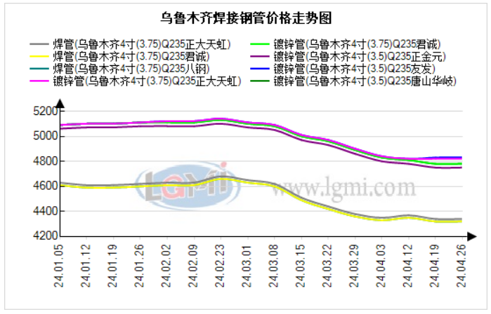 今日乌鲁木齐管材市场价格小幅下将运行,市场个别贸易商在节前备货,但是市场大部分均是以出货为主。兰格钢铁云商平台监测数据显示,截至2024年4月28日,焊管方面:八钢、正大、友发、君诚焊管4寸(3.75mm)价格为4300-4320元,较上个交易日价格跌20元;镀锌管方面:正大、友发、君诚、唐山华岐、金正元镀锌管4寸(3.75mm)价格为:4730-4810元,较上个交易日价格跌20元。