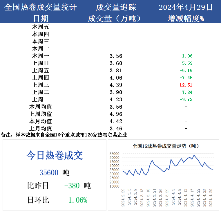- 4月29日全国16个城市热轧板卷大户日成交量减少2024/4/29
