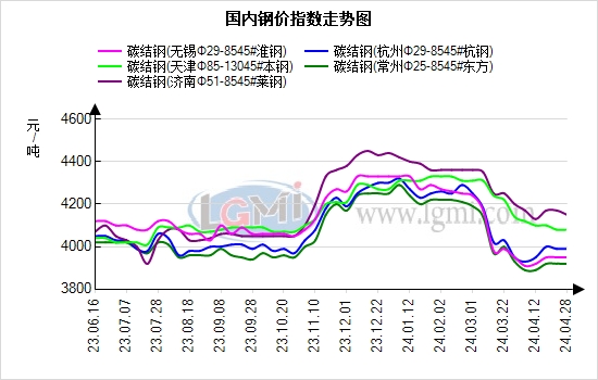 4月29日国内优特钢市场价格持稳运行。据兰格钢铁云商平台监测数据显示,国内重点城市45#碳结钢85mm平均报价4185元,40Cr合结钢85mm平均报价4373元,较上个交易日持平。