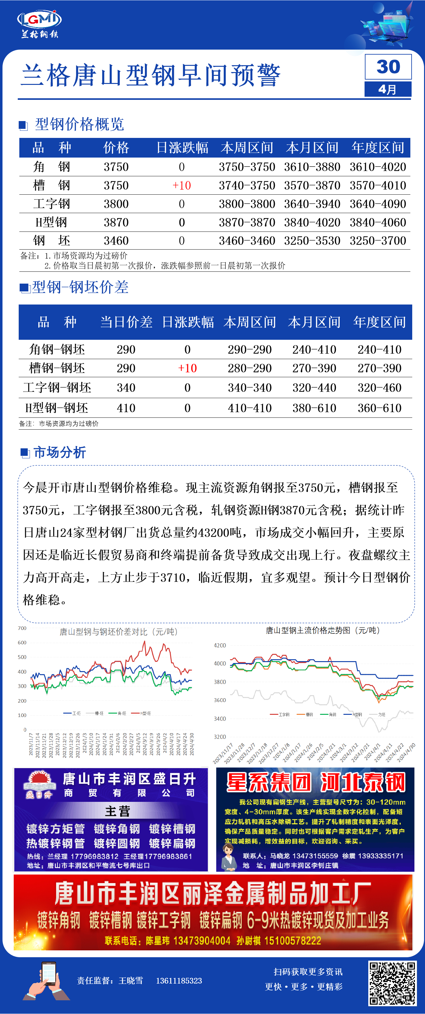 4月30日兰格唐山型钢早间预警