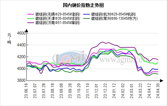 4月30日国内优特钢市场价格持稳运行。据兰格钢铁云商平台监测数据显示,国内重点城市45#碳结钢85mm平均报价4185元,40Cr合结钢85mm平均报价4373元,较上个交易日持平。