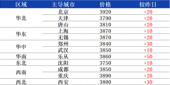 南北价差方面,重点城市乐从3860元、唐山3810元,两地价差50元,邯郸3820元、无锡3870元,两地价差50元左右。