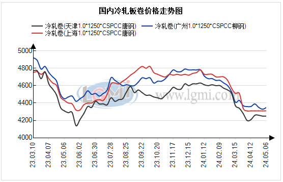 5月6日国内冷轧市场价格涨跌互现。据兰格钢铁云商平台监测统计,国内1.0mm冷卷均价4329元,较上一个交易日下降4元。上海1.0mm冷轧板卷价格4310元,较上一交易日持平;广州1.0mm冷轧板卷价格4350元,较上一交易日上涨20元;天津1.0mm冷轧板卷价格4250元,较上一交易日持平。