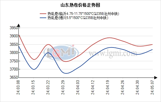 山东热卷市场价格震荡走弱,市场整体交投气氛偏弱。期货盘面震荡下行,收盘有所下跌。现货市场方面,贸易商仍以出货为主,但下游以及终端业者受期货下行以及供需面弱势因素影响弱势采购意愿偏弱,贸易商存在一定出货压力。贸易商多跌价促市,今日山东热卷市场跌幅多在10-20元。市场价格方面,博兴区域沧州中铁3790元,较昨日下跌30元;临沂沧州中铁热卷价格3840元,较昨日下跌10元。整体来看,热卷市场中长期交易逻辑并未出现明显的变化,市场仍重点围绕基本面特别是供需矛盾运行,而短期受强供应因素影响,市场供需矛盾短期难以缓解,特别是社会库存已经开始呈现累库的情况,也在一定程度上增加了业者的观望情绪。