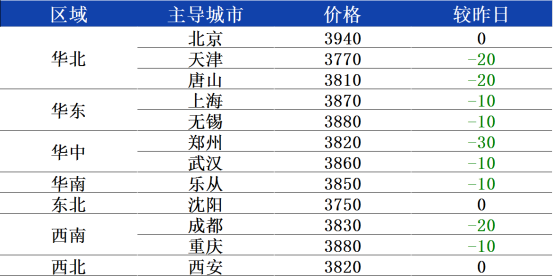南北价差方面,重点城市乐从3850元、唐山3810元,两地价差40元,邯郸3800元、无锡3880元,两地价差80元左右。