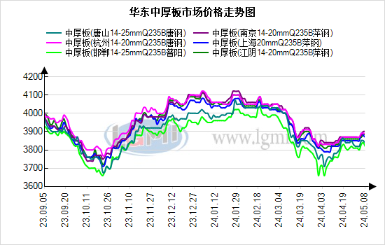 5月8日,华东地区中厚板市场价格有所盘整,目前上海报3870元、江阴报3890元、南京报3900元、杭州报3900元、宁波3900元,商家心态转弱,交易有所让利。南北价差有所扩大,北方市场以邯郸、唐山为主,南方市场以江阴、上海等地为主,邯郸和江阴价差在60元,江阴较高;上海和唐山价差在40元,北材南运仍无优势可言,华东仅有少量北方资源。