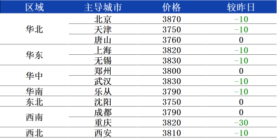 南北价差方面,重点城市乐从3790元、唐山3760元,两地价差30元,邯郸3780元、无锡3830元,两地价差50元左右,南北价差小幅收窄。